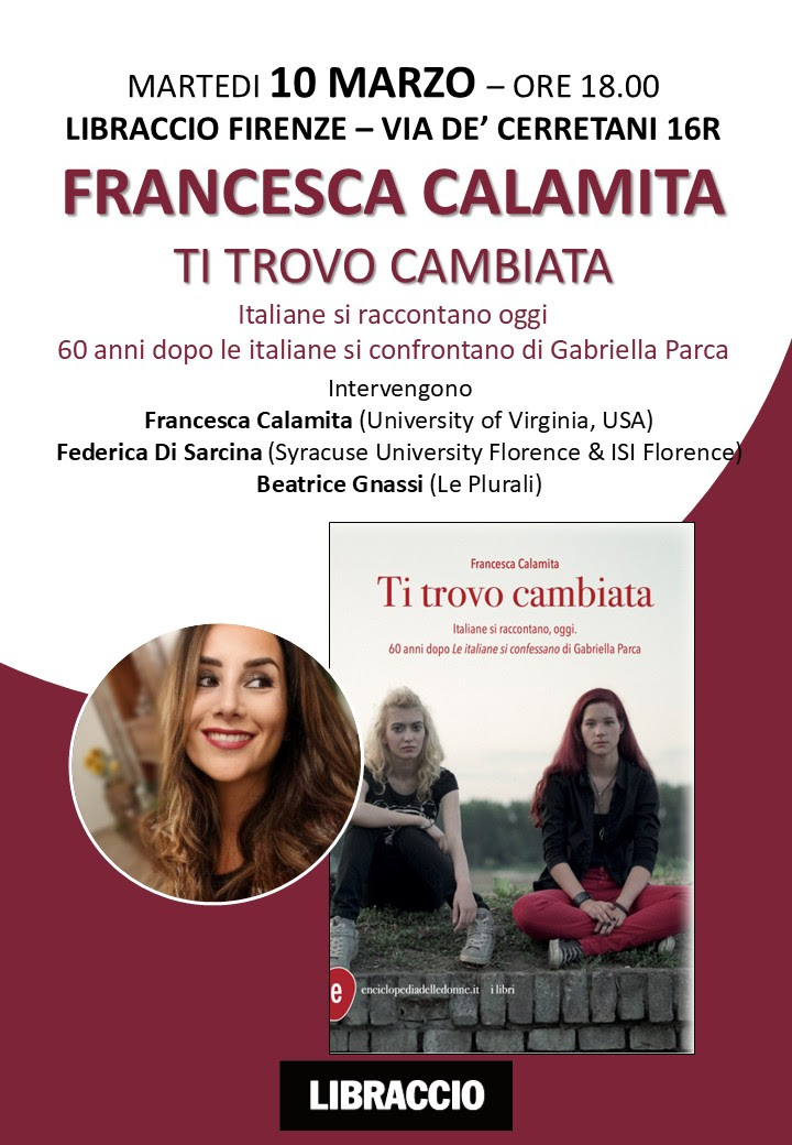 L’autrice Francesca Calamita (University of Virginia, USA) in dialogo con Federica Di Sarcina (Syracuse University Florence & ISI Florence) e Beatrice Gnassi (Le Plurali) presenta la nostra nuova uscita: Ti trovo cambiata, un libro che interroga le italiane di oggi a distanza di quasi 60 anni dalla pubblicazione di Le italiane si confessano di Gabriella Parca.