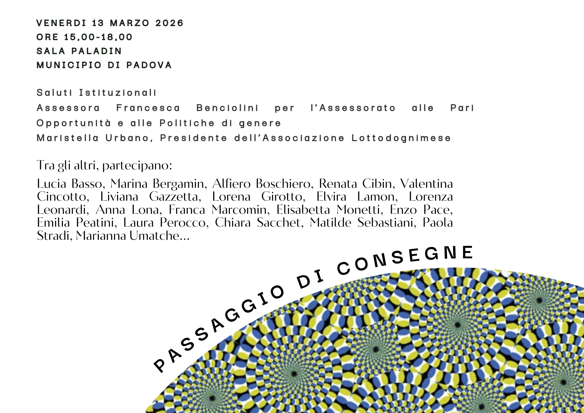 L’Associazione Lottodognimese, in collaborazione con Lucia Basso e Liviana Gazzetta, organizza l’incontro pubblico “Passaggio di consegne - Il privato è politico tutto la vita”. Un pomeriggio di confronto sul femminismo e sui movimenti delle donne, a partire dal volume Passaggio di consegne di Marina Piazza.