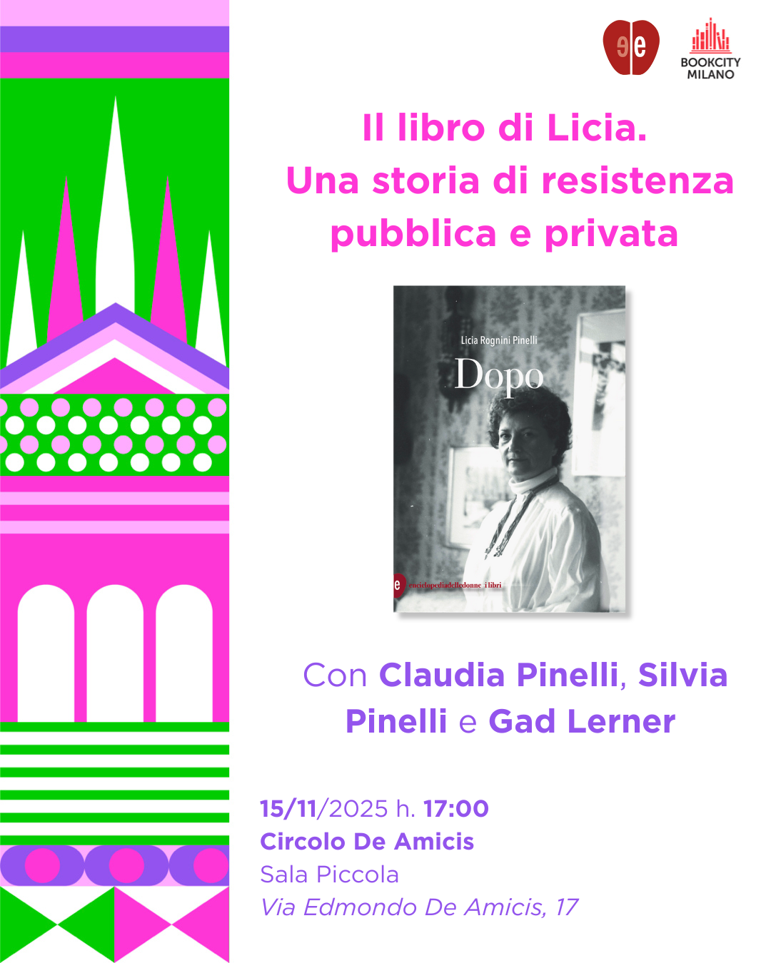 Presentazione di Dopo di Licia Pinelli con Claudia e Silvia Pinelli in dialogo con Gad Lerner al Circolo De Amicis. L'evento fa parte dell'iniziativa BookCity Milano 2025.