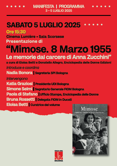 Introduce e coordina Nadia Bonora | Segreteria SPI Bologna Intervengono: Katia Graziosi | Presidente UDI Bologna Simone Selmi | Segretario Generale FIOM Bologna Paola di Stefano | Ufficio Stampa, Enciclopedia delle Donne Bruna Rossetti | Delegata FIOM In Ducati Eloisa Betti | Curatrice del volume. L'incontro si terrà nella Sala Scorsese.