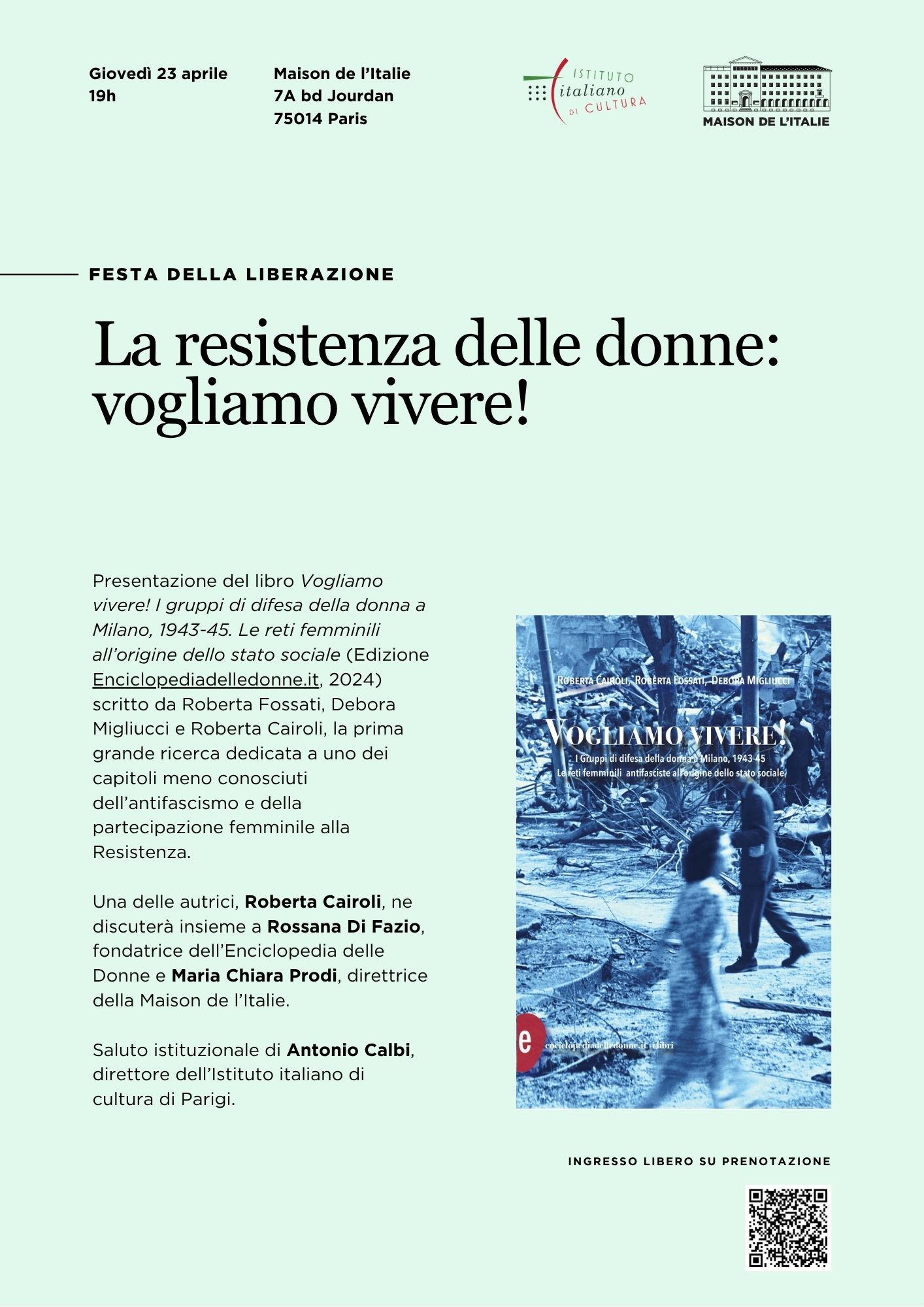 L'occasione per parlare di questa relazione e della sostanza di questo impegno, delle personalità che l'hanno realizzato, è il libro Vogliamo vivere! I gruppi di difesa della donna a Milano, 1943-45. Le reti femminili all'origine dello stato sociale, scritto da Roberta Fossati, Debora Migliucci e Roberta Cairoli. Ne parleranno Roberta Cairoli e Rossana Di Fazio (cofondatrice di enciclopediadelledonne.it) insieme a Maria Chiara Prodi, direttrice della Maison d'Italie alla Cité Universitaire di Parigi.